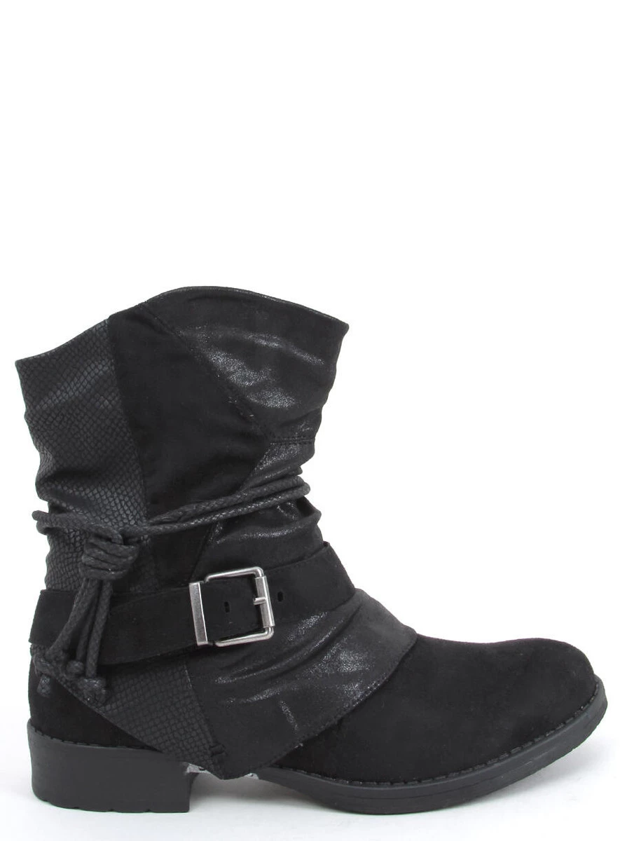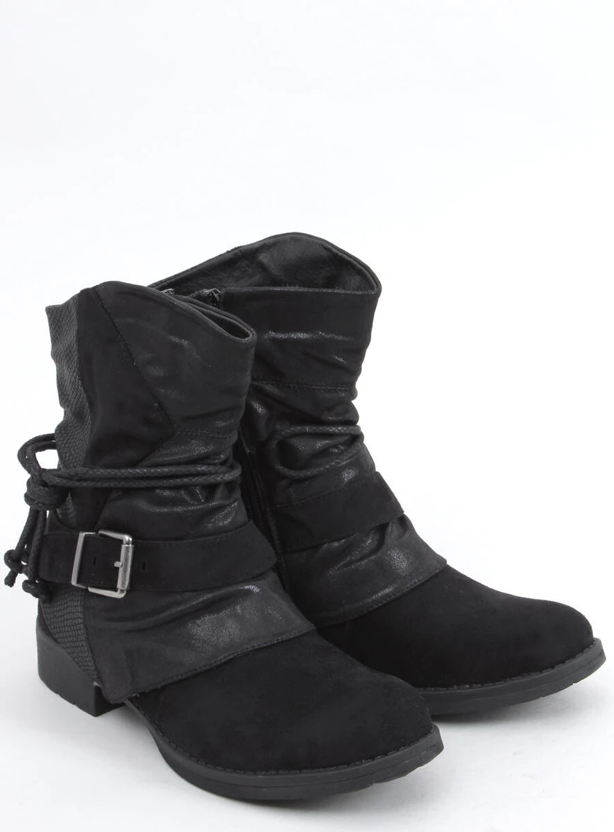 Botki damskie w militarnym stylu. Model wyróżnia się modnie marszczonym kołnierzem z klamerką oraz efektownymi dodatkami – wstawki o fakturze skóry węża oraz subtelnie mieniące się. Z pewnością przyciągną spojrzenia. Praktyczny zamek z boku ułatwia zakładanie. Wnętrze butów wyścielone jest delikatnym futerkiem. Materiał zewnętrzny – zamsz ekologiczny + skóra ekologiczna.