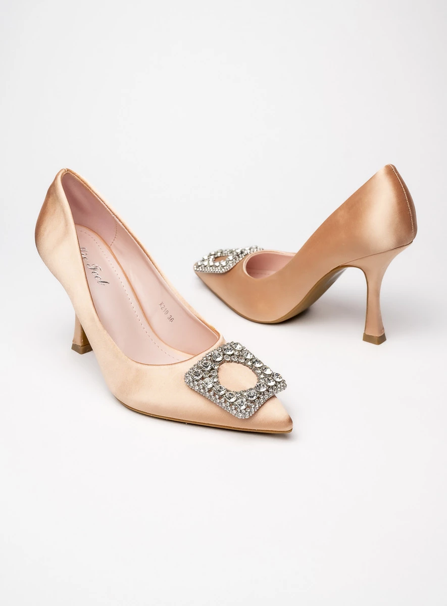 Damskie czółenka Velmira to kwintesencja elegancji i klasy. Wykonane z satynowego materiału o subtelnym połysku, prezentują się niezwykle szykownie i ekskluzywnie. Ich smukły fason, spiczasty nosek oraz delikatny obcas dodają sylwetce lekkości i finezji. Błyszcząca ozdoba na przodzie w postaci kryształowej klamry sprawia, że buty są idealnym wyborem na wyjątkowe okazje, takie jak wesela, bankiety czy eleganckie przyjęcia.