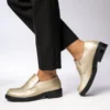 Damskie mokasyny ELYDA GOLD to wyjątkowe połączenie klasyki i nowoczesnego blasku. Metaliczna złota cholewka z ekoskóry sprawia, że ten model wyróżnia się w każdej stylizacji, a stabilna, czarna podeszwa dodaje im charakteru. Elegancka kokarda z efektownymi złotymi detalami podkreśla luksusowy design, czyniąc je idealnym wyborem na specjalne okazje oraz codzienne stylizacje.