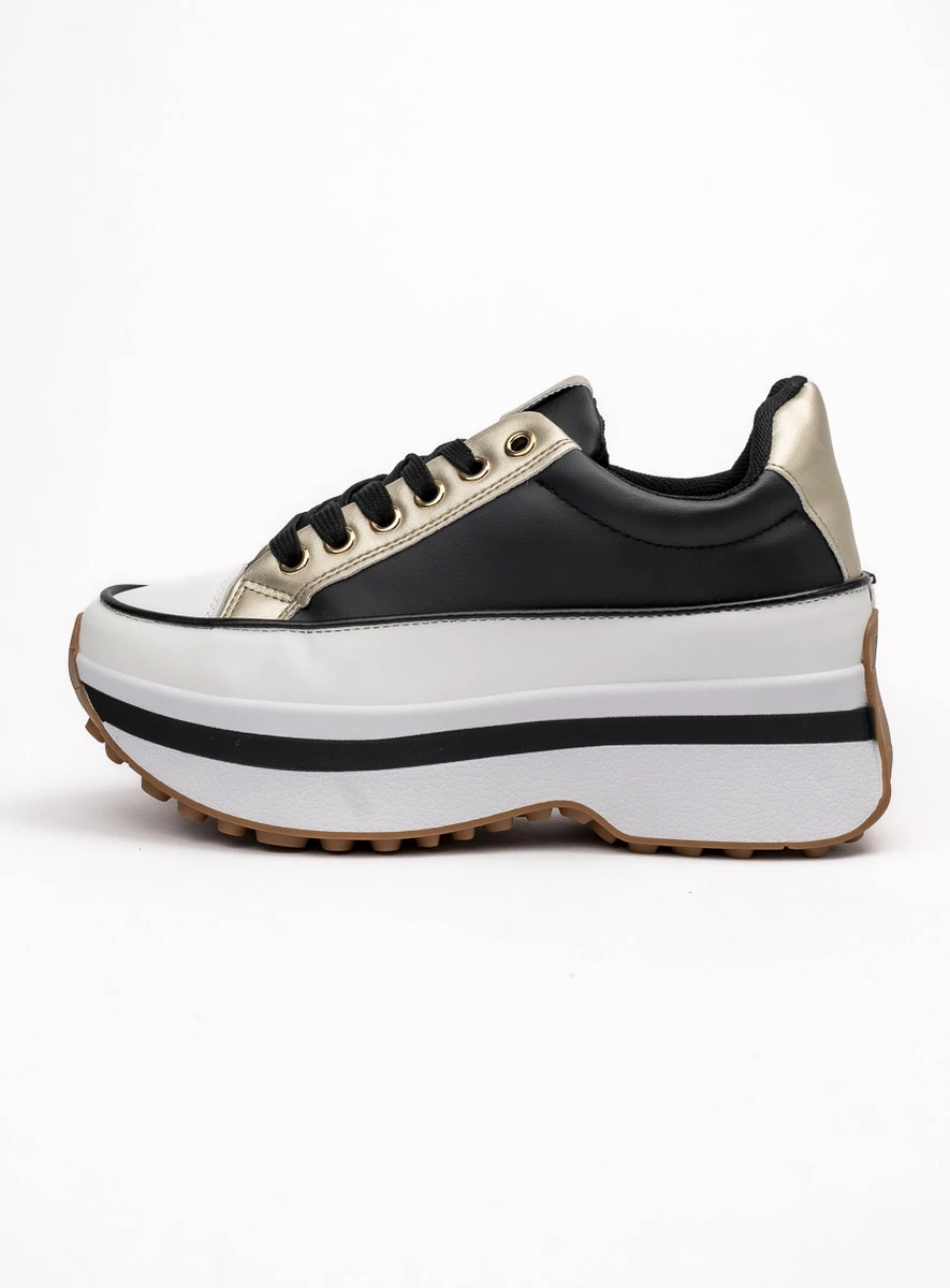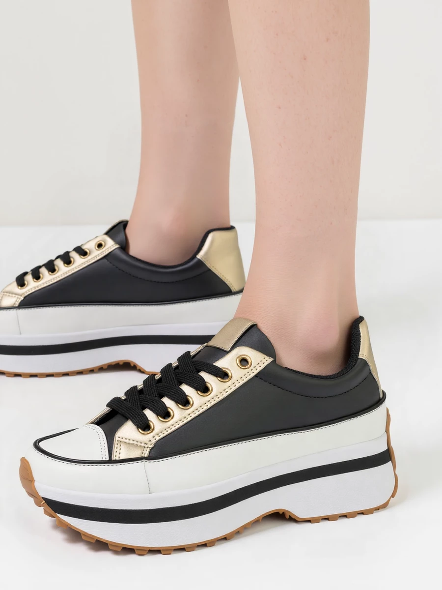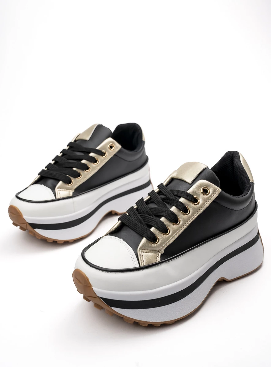 Damskie Sneakersy BLAIR BLACK to połączenie czerni i złota w nowoczesnym wydaniu. Gruba, wielowarstwowa podeszwa nie tylko dodaje kilku centymetrów wzrostu, ale także nadaje butom wyrazistego charakteru. Złote wstawki przyciągają wzrok i podkreślają miejski styl, a solidne sznurowanie zapewnia stabilne dopasowanie do stopy. Te sneakersy to idealny wybór dla kobiet, które lubią łączyć wygodę z odważnym designem.