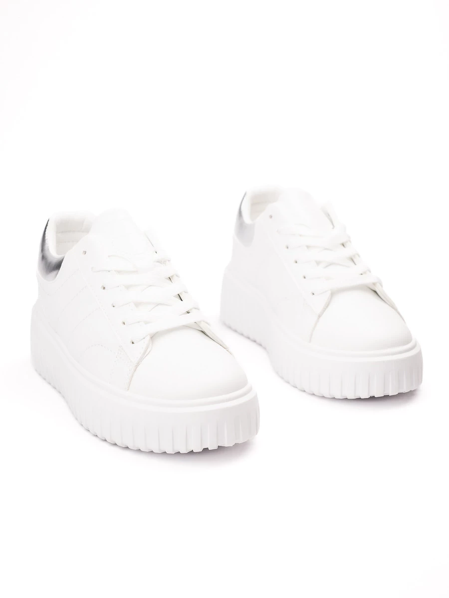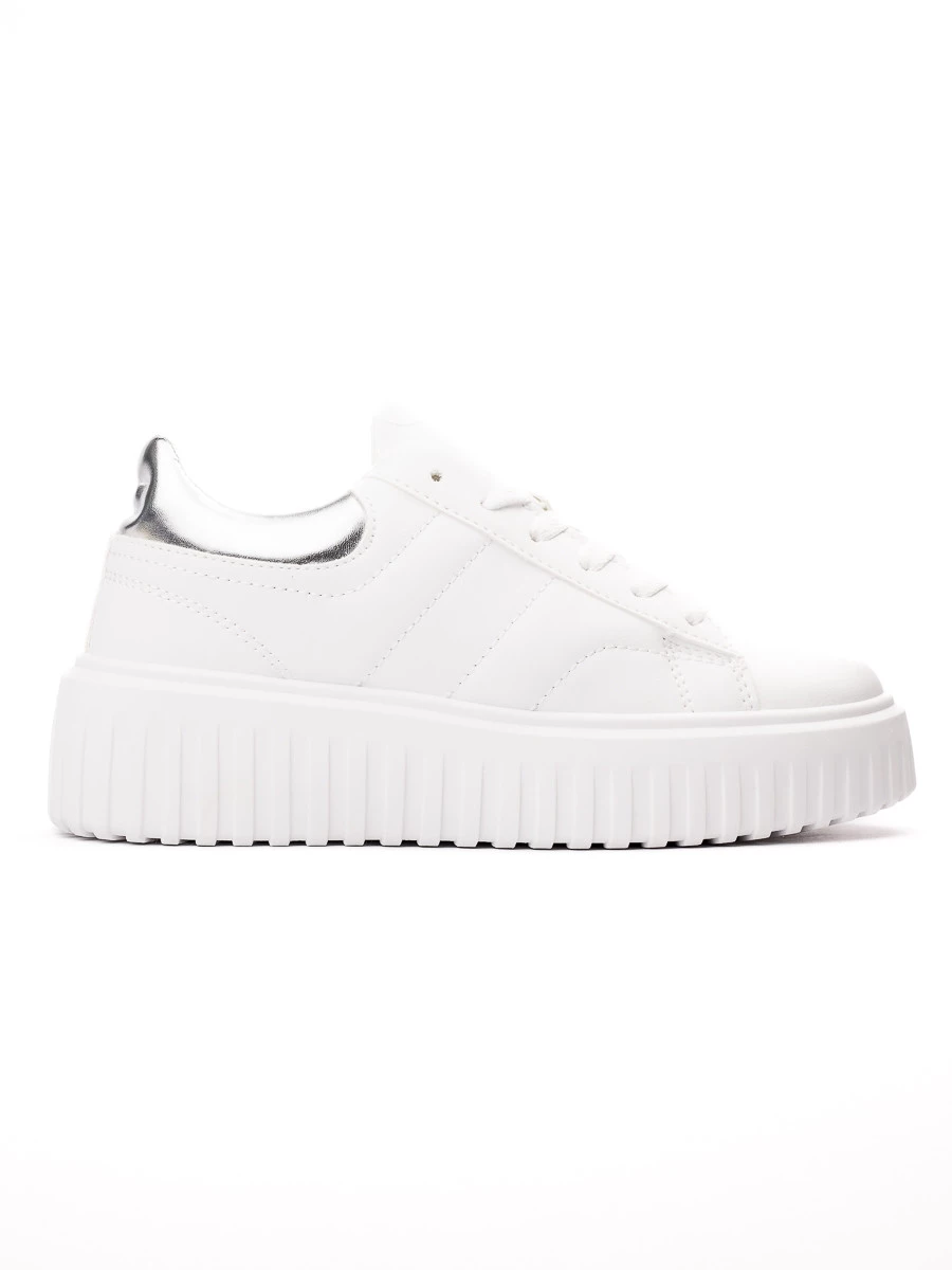 Sneakersy HERA w kolorze SILVER (srebrne) to model, który łączy klasykę z nowoczesnym stylem. Wykonane z białej skóry syntetycznej, z metalicznymi akcentami w kolorze srebrnym na pięcie, które nadają butom elegancki, ale sportowy wygląd. Gruba, teksturowana podeszwa zapewnia stabilność i komfort na każdym kroku. Idealne na co dzień, do stylizacji casualowych oraz na spacer.