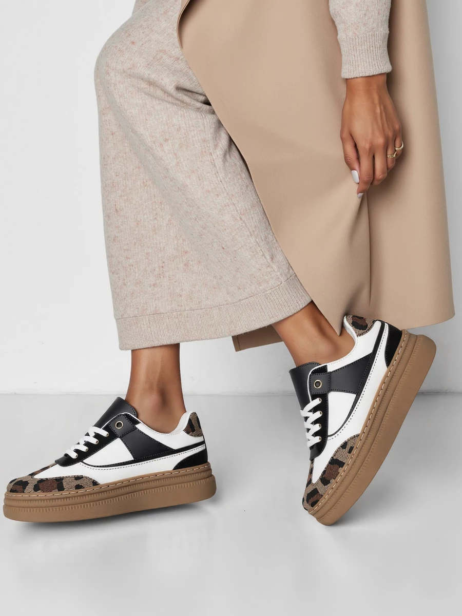 Sneakersy damskie w kolorze białym, z czarnymi wstawkami, wykonane z połączenia tworzywa sztucznego i materiału tekstylnego z imitacją futerka w zwierzęcy wzór. Model posiada gumową, jednolitą podeszwę w odcieniu brązu, która zapewnia wygodę i stabilność podczas chodzenia.