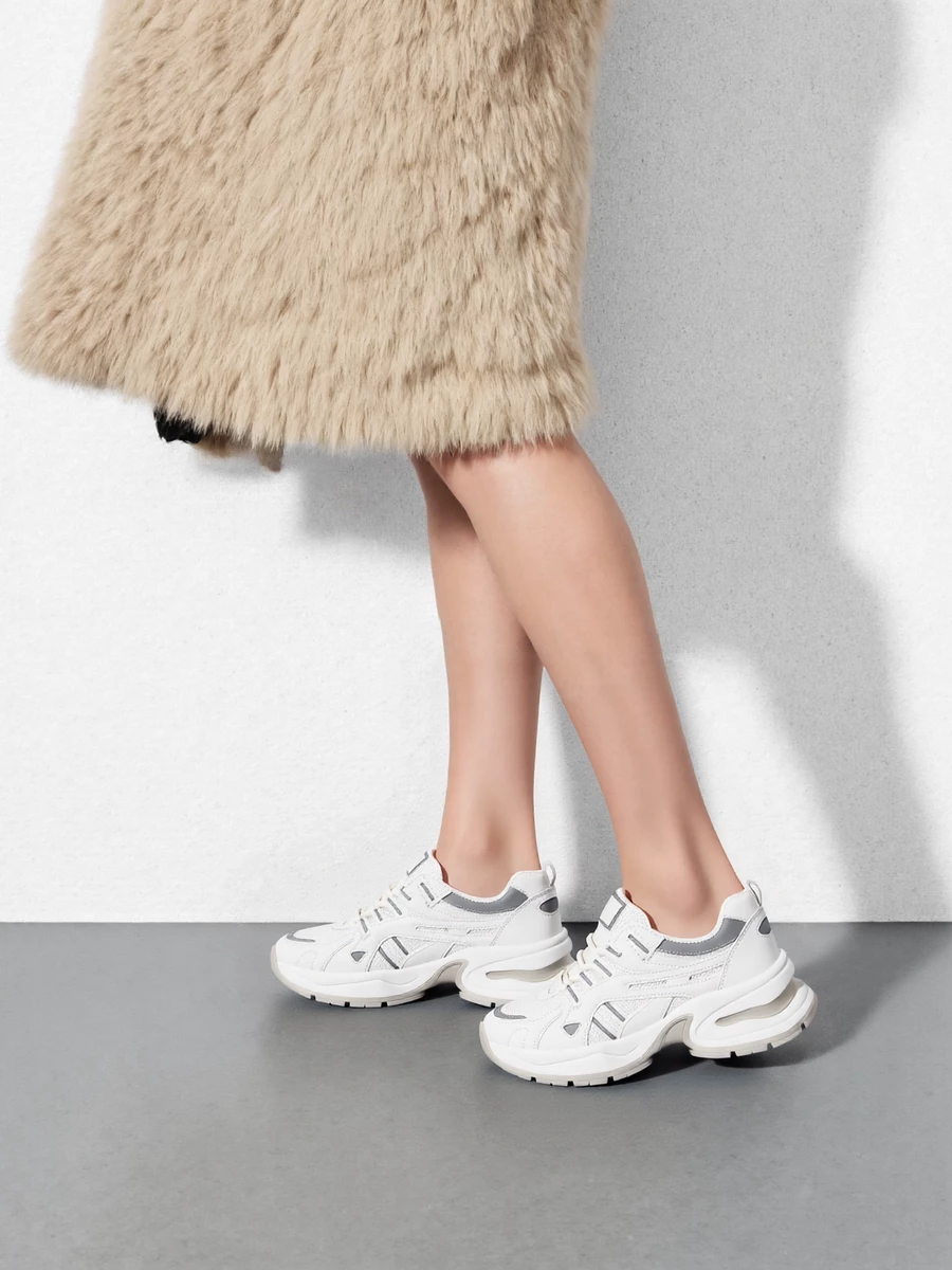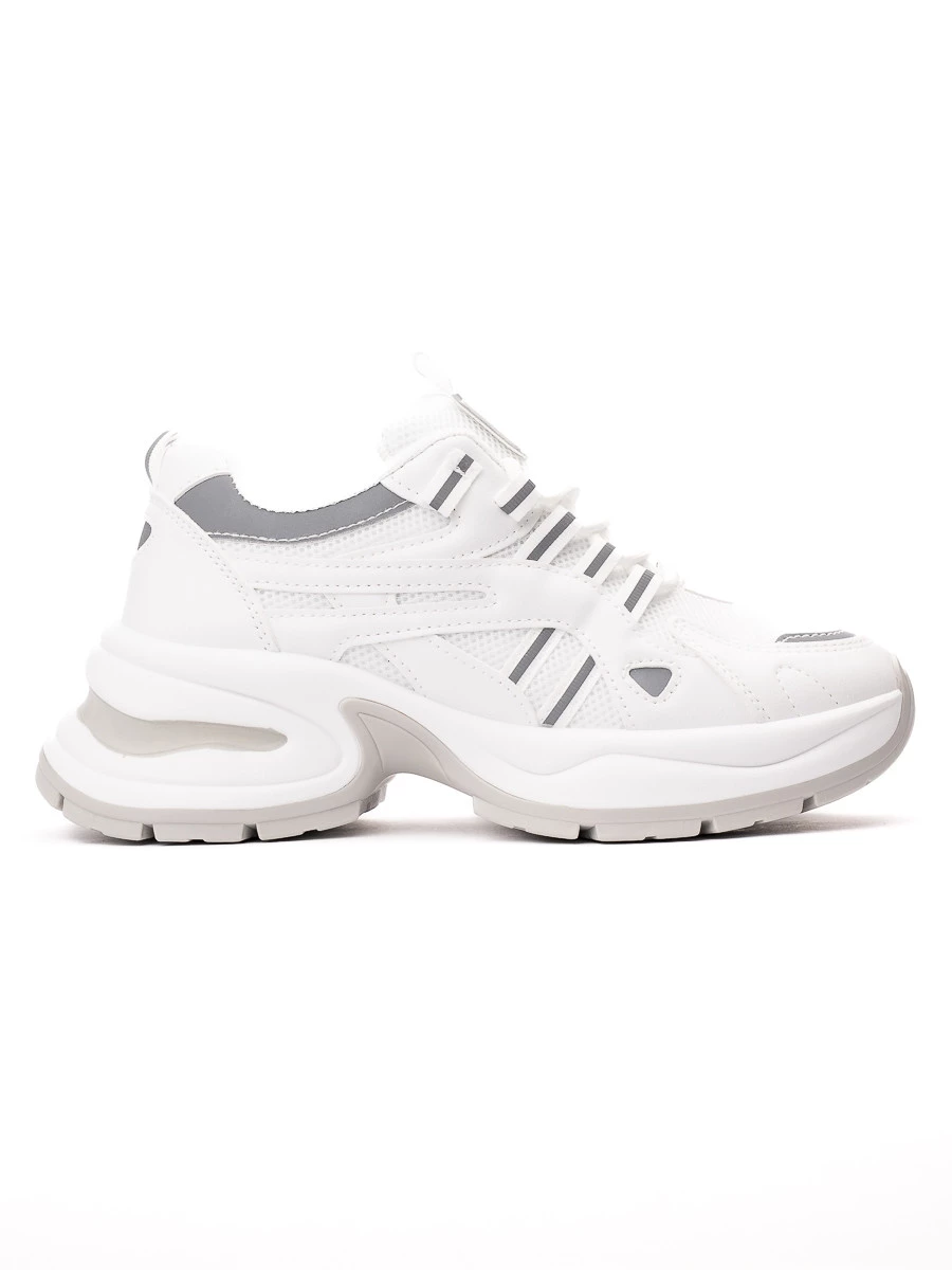 Sneakersy LYRA w kolorze WHITE (białe) to elegancki, sportowy model, który doskonale wpisuje się w trendy streetwearowe. Wierzch butów wykonany z połączenia przewiewnej tkaniny oraz skóry syntetycznej, ozdobiony subtelnymi akcentami w kolorze szarym. Gruba, amortyzowana podeszwa zapewnia komfort przez cały dzień, a nowoczesny design z delikatnymi detalami sprawia, że będą one idealnym wyborem na co dzień, spacery oraz do aktywności fizycznych.