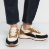 Sneakersy XERON w złotym, metalicznym wykończeniu to połączenie futurystycznego stylu i codziennego komfortu. Ich lustrzana powierzchnia przyciąga uwagę, a kontrastujące beżowe wstawki dodają unikalnego charakteru. Gumowa podeszwa w karmelowym odcieniu zapewnia stabilność i wygodę na co dzień. Idealne do casualowych i odważnych stylizacji.
