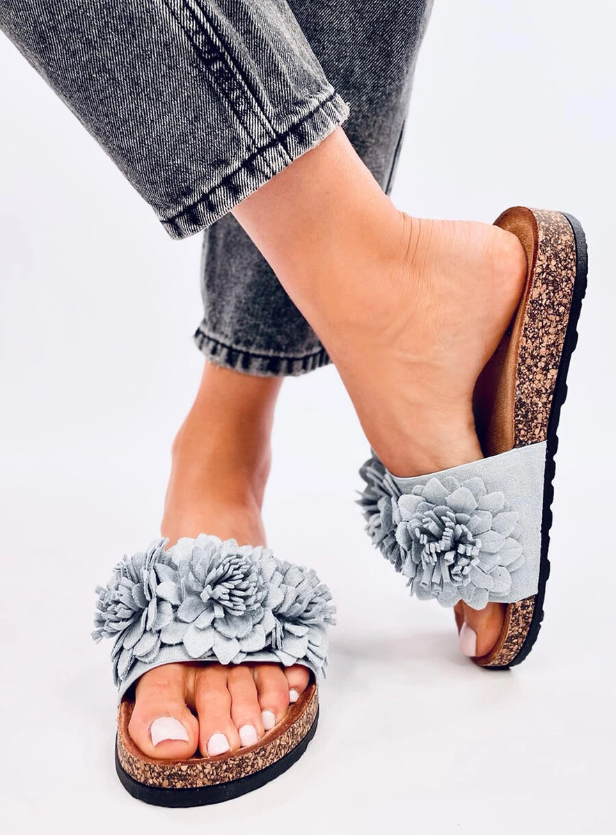 Zamszowe klapki damskie na korku. Kwiecista aplikacja wspaniale urozmaica ten ponadczasowy model… Profilowana wkładka wewnętrzna gwarantuje komfort na każdym kroku. To idealne buty na lato! Materiał zewnętrzny – zamsz ekologiczny.