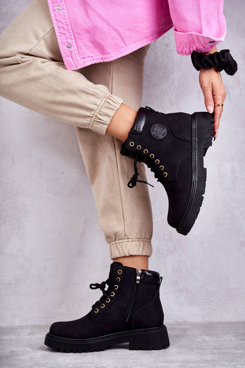 Skórzane Ocieplane Botki Trapery Czarne Felizia