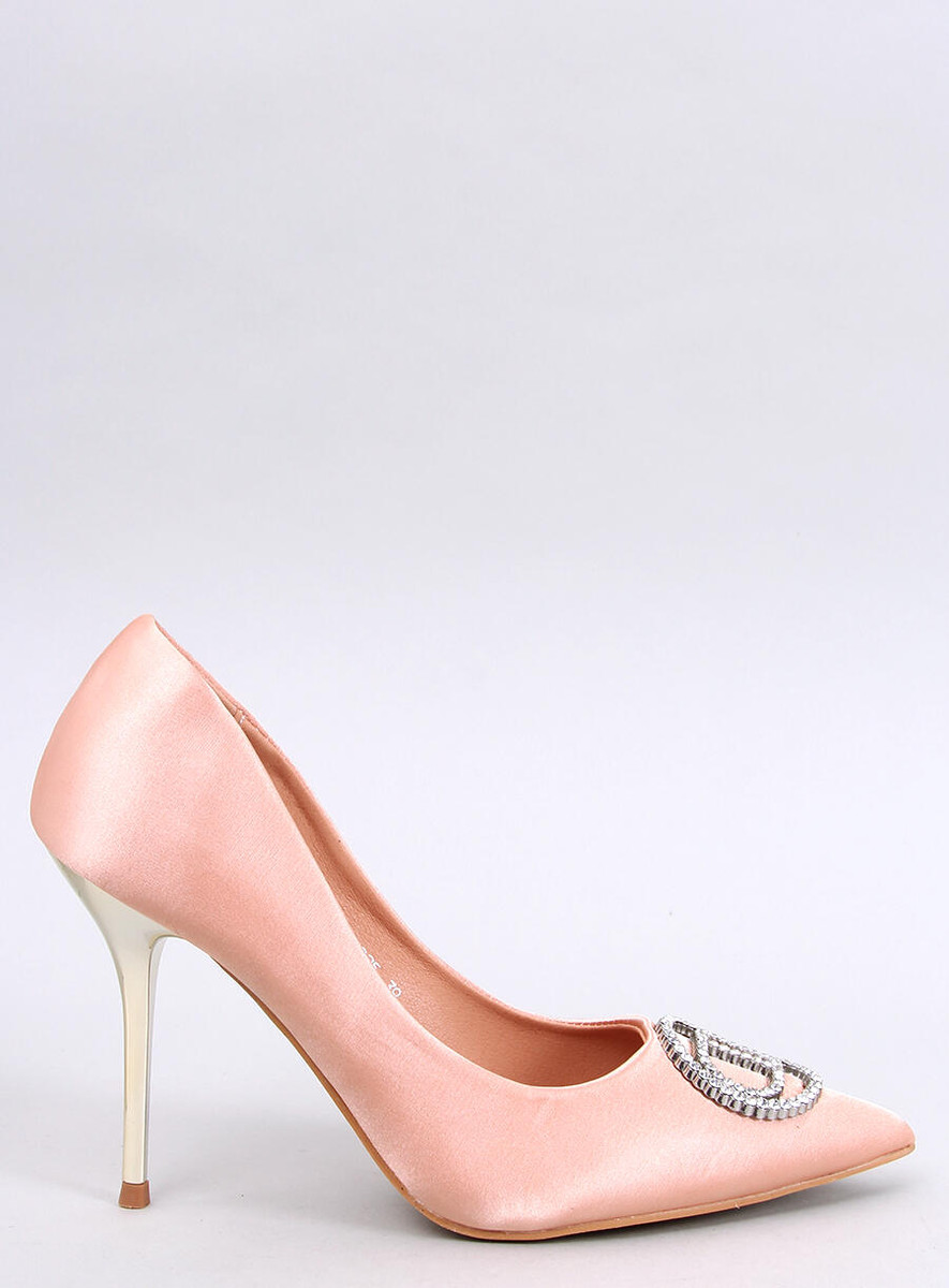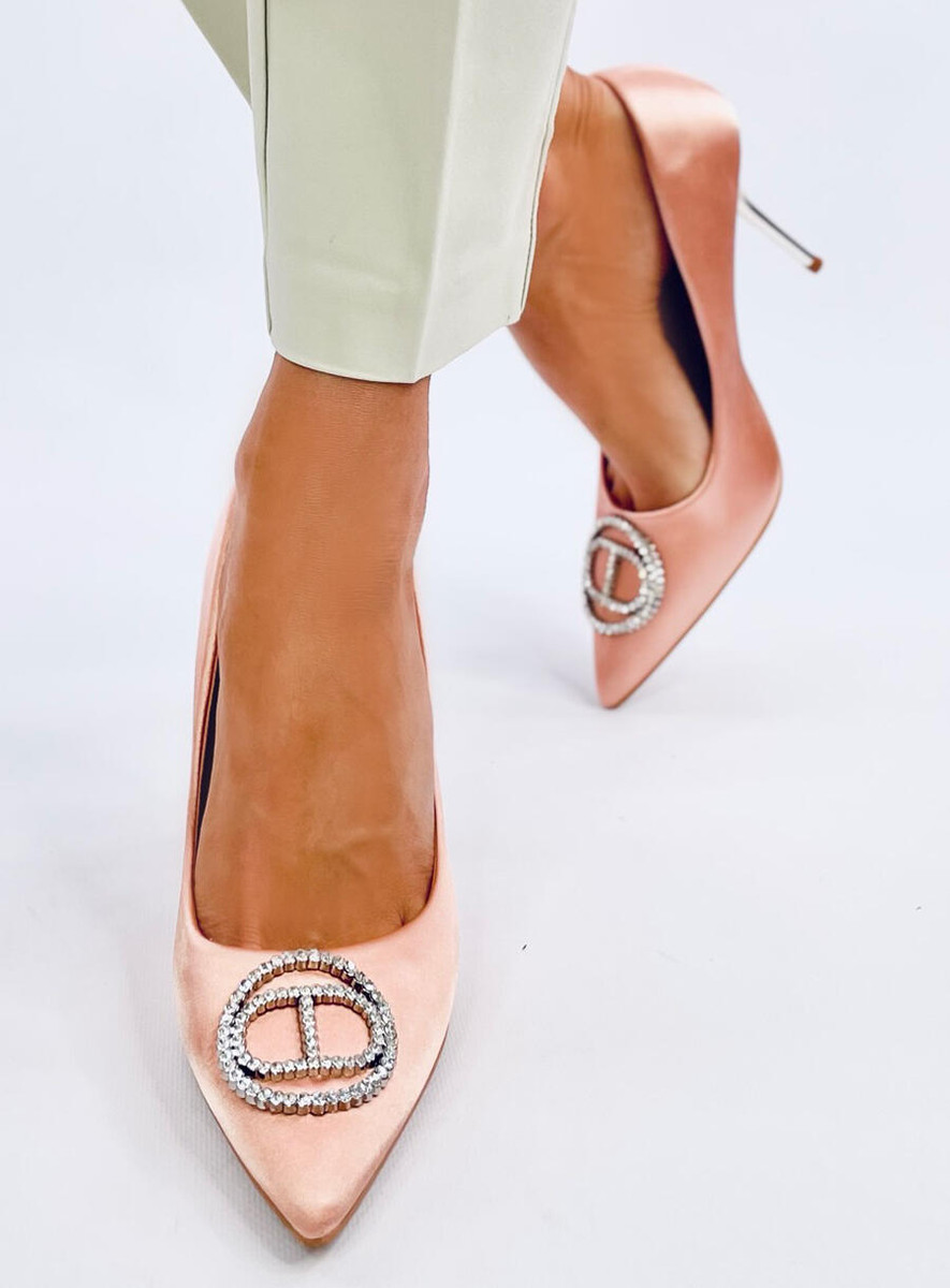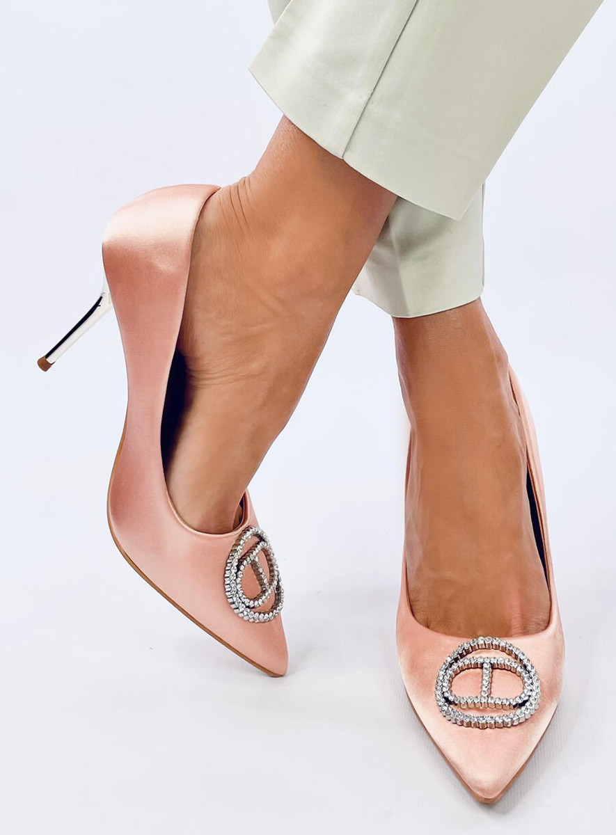 Eleganckie szpilki damskie. Ozdoba z błyszczącymi kryształkami i satynowe wykończenie to idealne połączenie! Metaliczny obcas o wysokości 10 cm wysmukli Twoją sylwetkę i przyciągnie spojrzenia… Idealny wybór na specjalne okazje : ) Materiał zewnętrzny – tkanina.